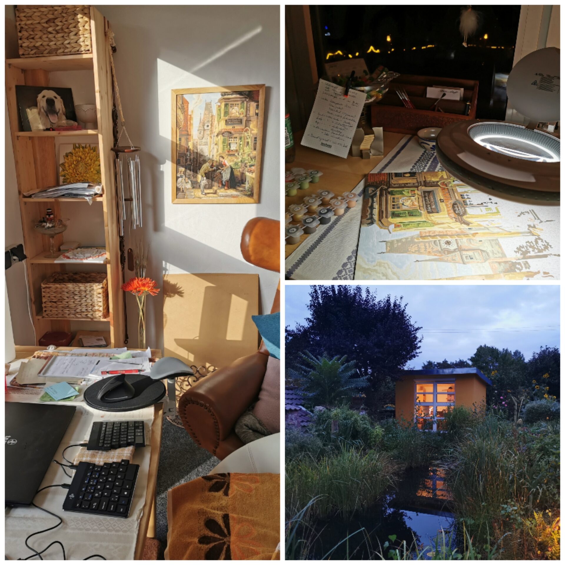 Darf ich vorstellen? Das ist mein kleines Atelier, in dem ich schreibe und, du erkennst es sicherlich, auch den Pinsel schwinge. Da ich besser schreiben als malen kann, habe ich mich vorerst auf Malen nach Zahlen spezialisiert. Ab und an male ich freihändig nach einer Fotografie. Das mache ich gar nicht schlecht, wenn ich das sagen darf. Bei Gelegenheit zeige ich dir mal eins meiner Werke.