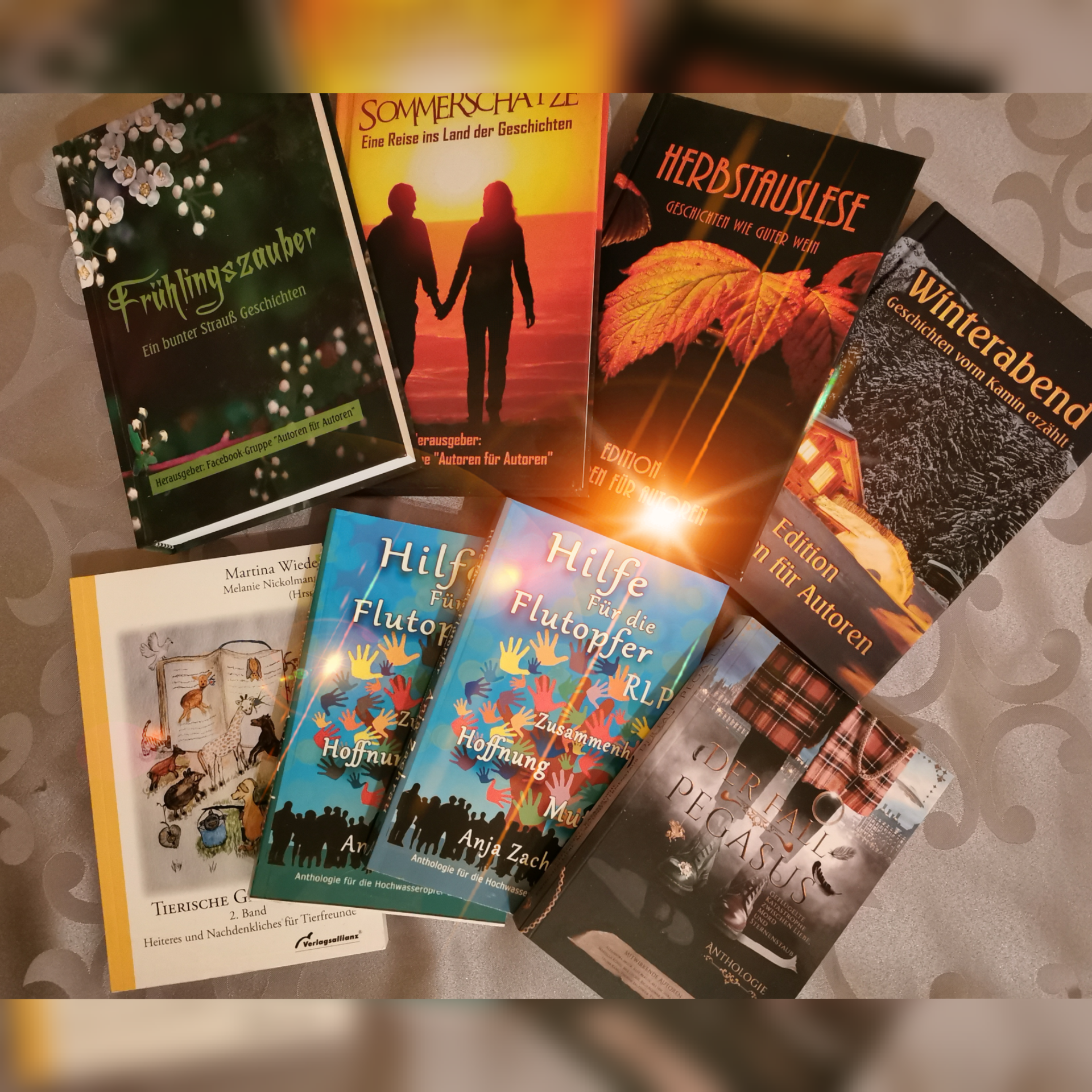 Dies sind (derzeit) alle Bücher, in denen Geschichten von mir enthalten sind. Manchmal nur eine, in anderen bis zu vier Stück. Ein paar Online-Veröffentlichungen habe ich auch vorzuweisen. Aber ganz ehrlich – so ein gedrucktes Buch, in dem mein Name steht, das ist doch etwas Handfesteres.